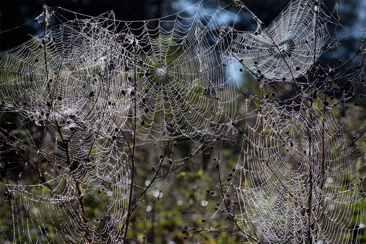Автор: Indina Одна из любимых тем – тема паутинок. Мечтаешь попасть в плотный туман и теплую погоду. Не всегда так совпадает, приезжаешь, паутинки есть, да они сухие. В одно июньское утро 2013 года нам посчастливилось застать удивительный момент природы, когда паутинки висят тяжелыми ожерельями везде, от маленькой травинки, до крон деревьев. Капельки росы на паутинках долго сохраняются в лесу, пока они в тени, но как на полянку заглядывает солнышко, только успевай, фотографируй, через 20-30 минут все исчезает, как в сказке…Паутинки иной раз воспринимаются мной, как юбочки фей на просушке, которые возвращались с ночного бала домой, да промочили их по дорожке …