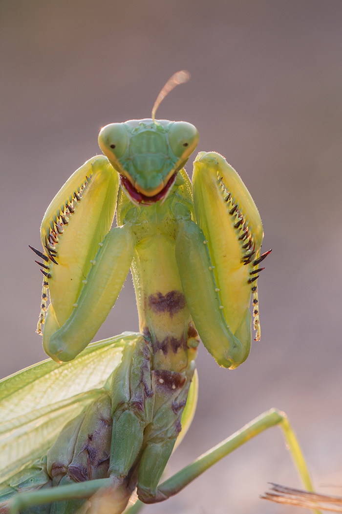 Богомолы всегда очень обаятельны и интересны своей мимикой, увидев опасность в лице фотографа, этот зелёный богомол принял защитную стойку обороны..
