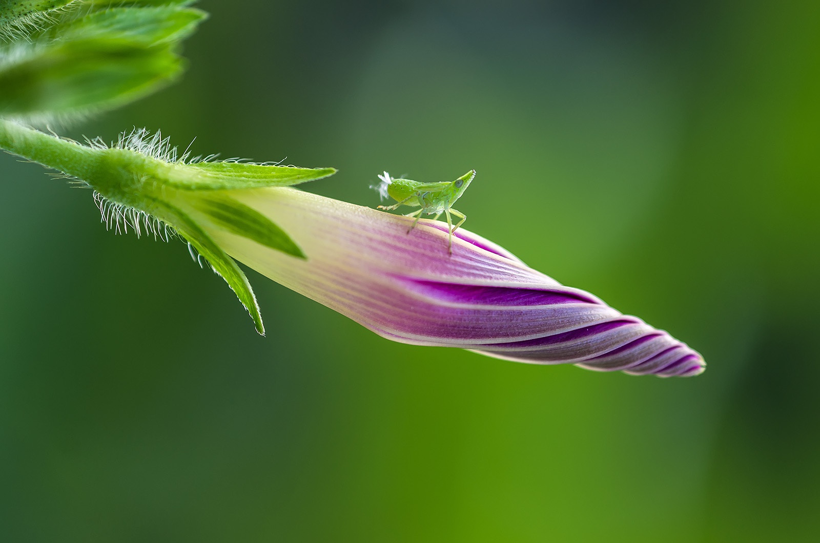 Летним вечером, обходя свои "охотничьи угодья" засмотрелся на бутоны вьюнка. Выбирая ракурс для кадра увидел, как по цветку ползёт "неведомый зверушка"! Он оказался очень шустрый и очень хитрый - все норовил спрятаться за цветок!