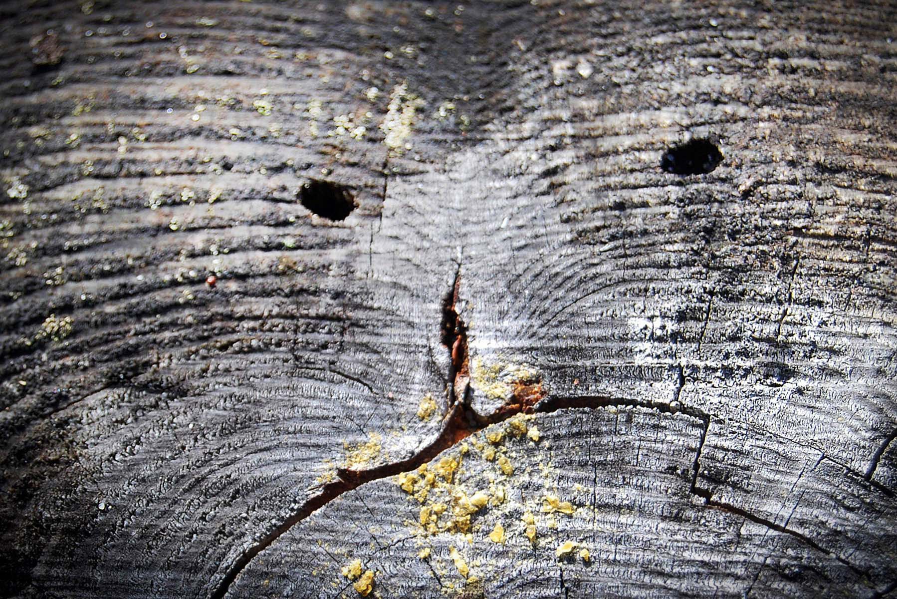Срез на старом пне похож на хитрого кота, съевшего без разрешения то ли сметану, то ли кашу.