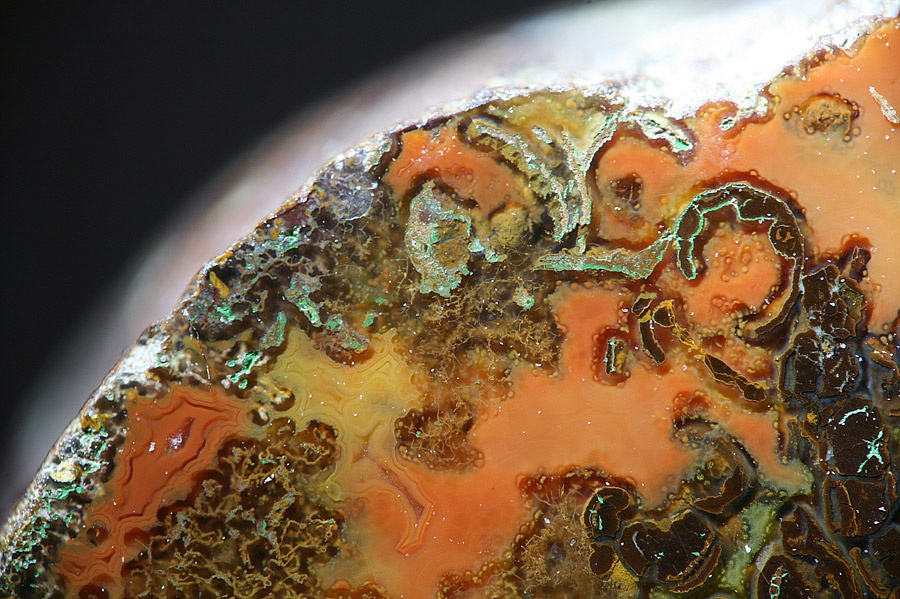 Разрезанный и отшлифованный камень выглядит красиво, Однако, если вглядеться в рисунок камня пристальнее, с помощью макрооптики, его частицы могут составить удивительные картины.