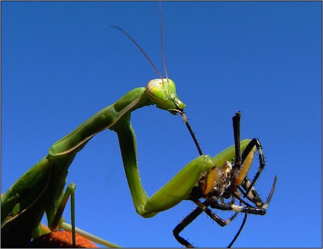 (Категогория: "Макропортрет")Рейтинг: 0Автор: ichipБогомол поедает паука-аргиопа (Паук-оса или паук-зебра)
