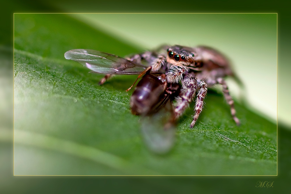 Я застал как паук тащил под лист свою добычу.... время шло на секундв снимал с руки несколько кадров.... хорошо получился только один... а жаль репортаж был бы класный.