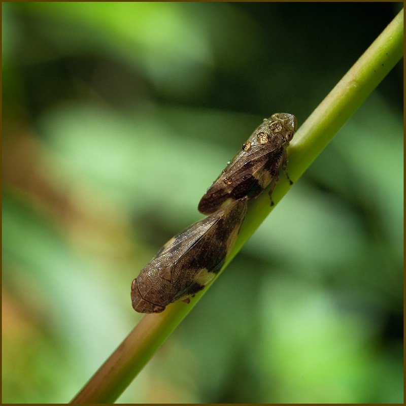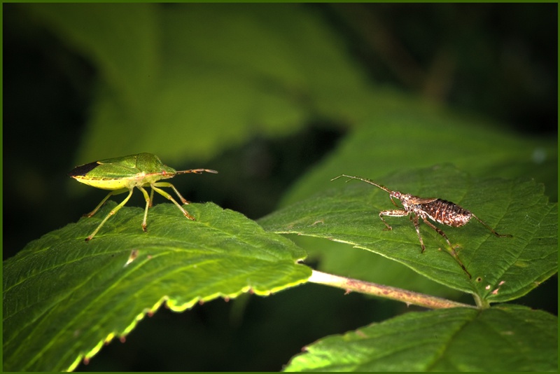 И действительно, на ближнем кусте малины он заметил нечто необычное: находившиеся на соседних листах два лесных клопа – старый крупный ярко-зелёный Щитник и молодой подвижный серый Хищнец, проводили непонятные манёвры. Точнее – передвигался Хищнец, который, собственно и был нарушителем спокойствия. Щитник как обычно, стоял на листе, широко расставив свои 6 лапок и, стараясь быть незаметным (что было несложно, учитывая его маскирующую зелёную окраску), поджидал себе на обед какую-нибудь невнимательную гусеницу… или цикадку…