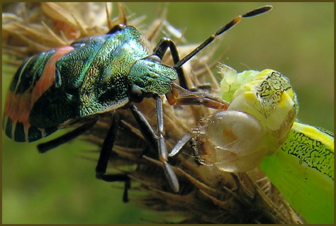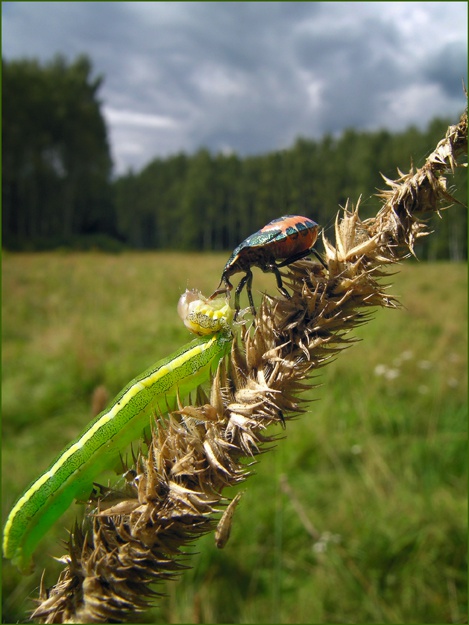 Паучку было немножко жаль гусеницу. Ах, если бы она смотрела, куда ползёт, то возможно, вовремя заметила бы клопа, имевшего яркую зеленовато-красноватую окраску, словно предупреждающую: «Берегись! Я опасен!»...