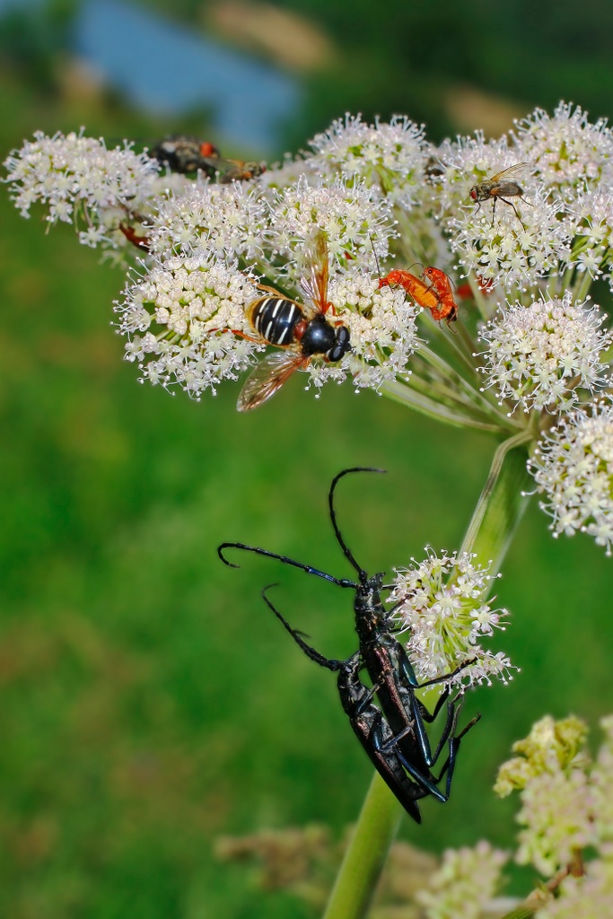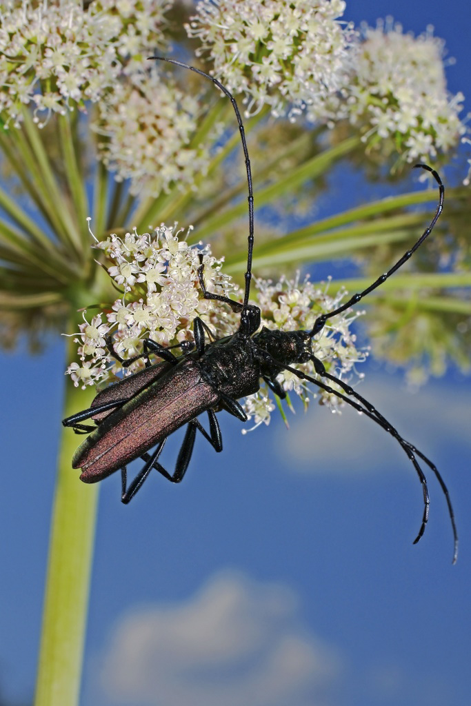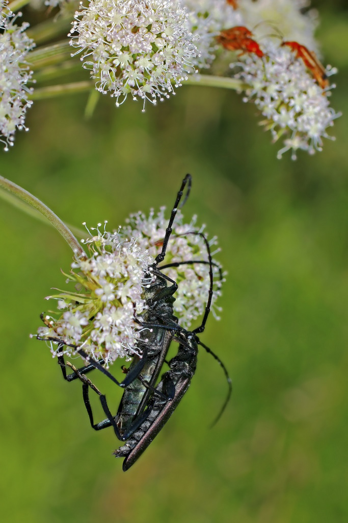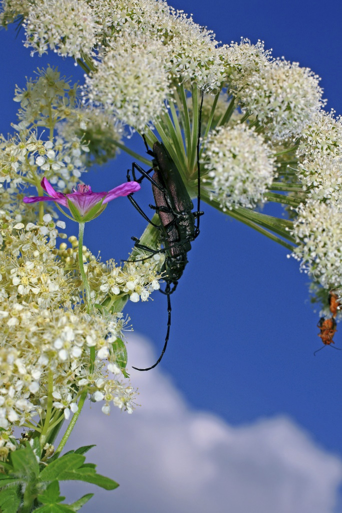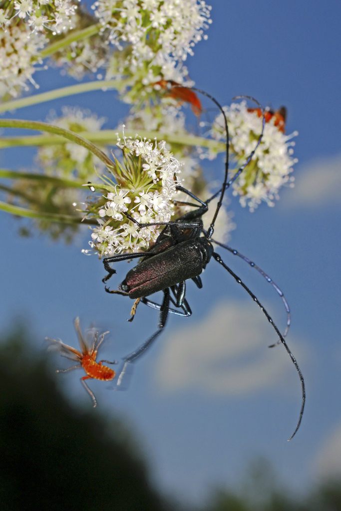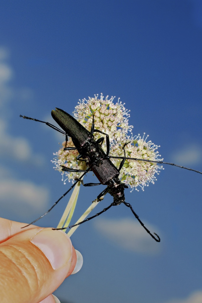 На соседний цветок прилетел еще один роскошный мускусный жук с длиннющими усами. Глядя на танцующих, его сердце забилось, ему понравилась грациозная жучиха. И он решил направить к этой паре своего друга, маленького драчуна и скандалиста, чтобы тот напал на танцующего усача и, воспользовавшись замешательством, пустился в танец с его прелестницей.