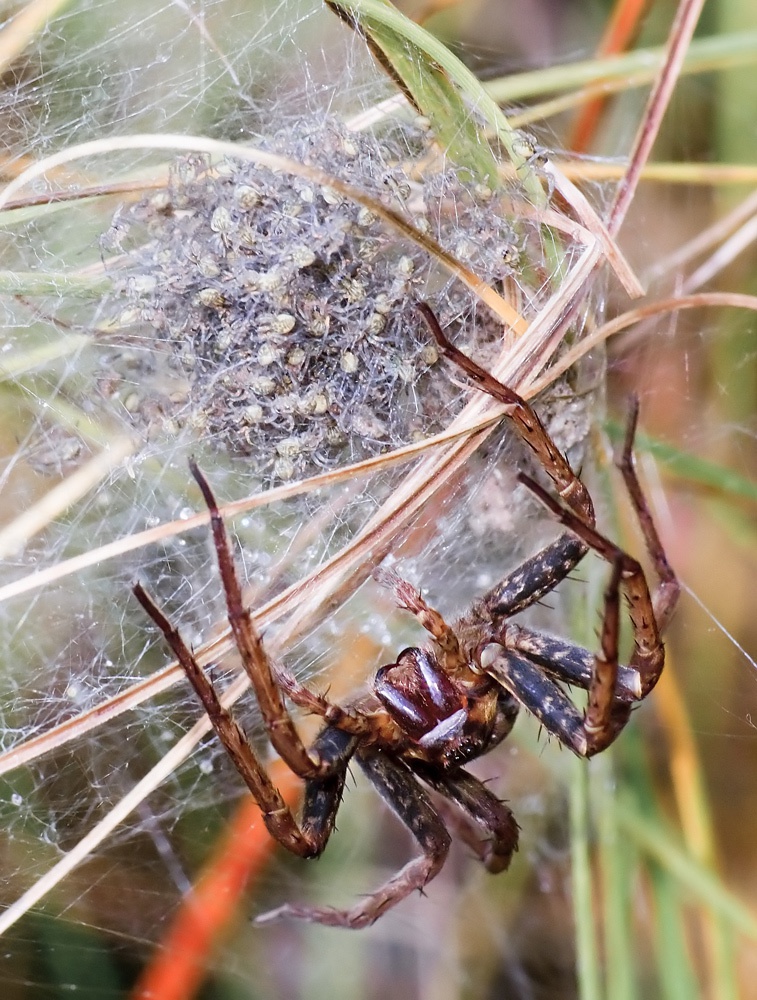 Author: Васильев_Игорь Когда ходил по болоту, балансируя на травяном матрасе, заметил крупного паука-охоника каемчатого. При пристальном внимании паук оказался паучихой, оберегающей свое гнездо, в котором клубилось несколько сотен малюсеньких прозрачных паучат. Самка была очень крупная, более 3-х см. в длину, и очень агрессивная, при попытке передвинуть её травинкой в более фотогеничное место яростно бросалась на оную травину и "грызла" ее своими клыками