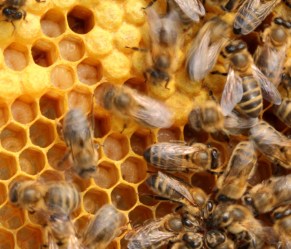 На открытом расплоде постоянно работают пчелы-кормилицы. Добавляют маточное молочко, мед, или пергу в зависимости от возраста личинки.