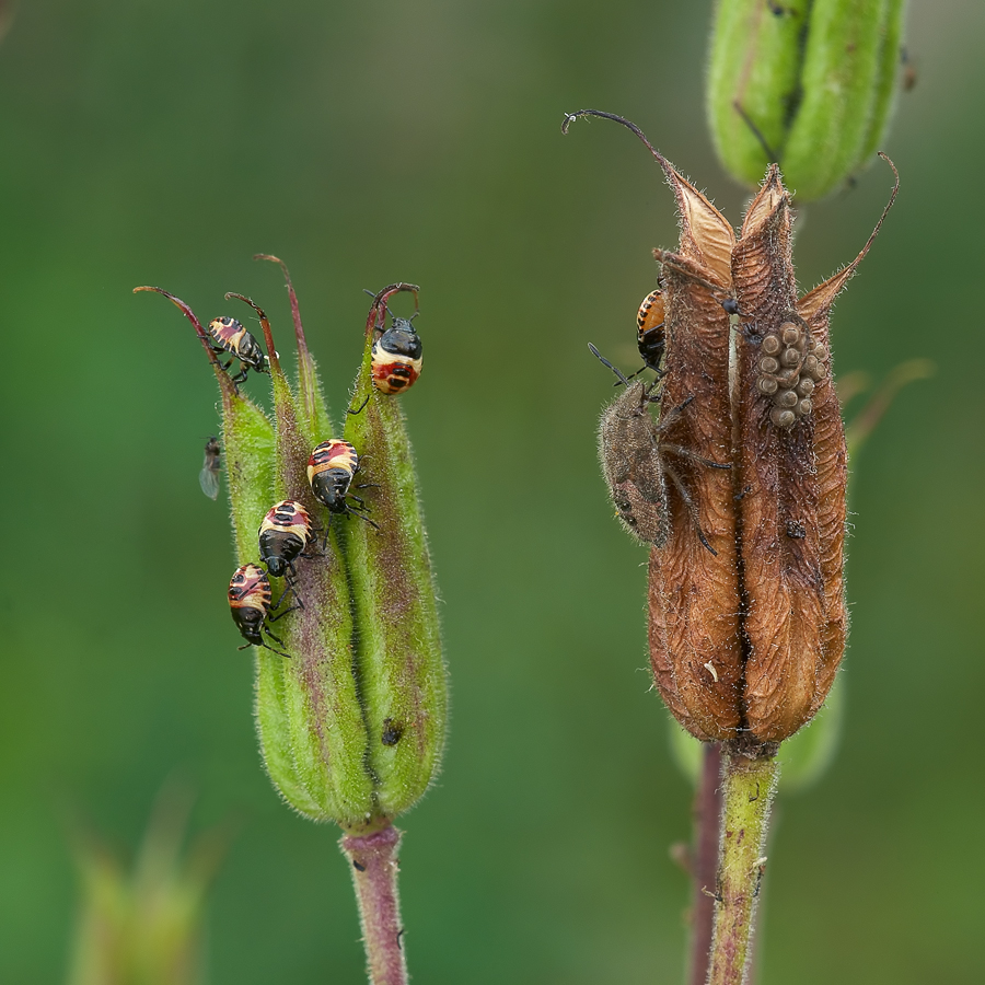 Несколько дней подряд наблюдал эту компанию на отцветшем водосборе. Они упорно держались вместе, пока ночная гроза не рзлучила их. Чем не проявление стайной заботы друг о друге?