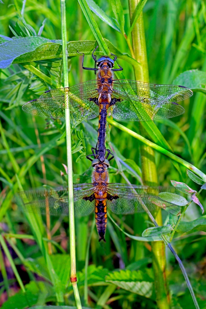 Эпитека двупятнистая, спаривающиеся стрекозы (Epitheca bimaculata, sparivanie strekoz). В конце июня мы приехали с супругом на одно озеро в Зарайском районе. Вечерело. У меня была задача найти засыпающих бабочек, чтобы можно было сделать их фото ночью. Пока муж раскладывал снасти, я тихонько пошла в поле, внимательно разглядывая цветы. И вдруг, услышала странные звуки в траве. Искала, искала взглядом и увидела двух крупных спаривающихся стрекоз. Что-то пошло не так, стрекоз увидела в виде «клубка», самка стремительно открепилась от живота самца и пыталась освободиться от него. Он улетел и метался над нами, в поисках другой самочки, а эта самочка осталась в непонятном положении, с выходящей «икрой» из брюшка. Потом она улетела, найти её уже не представлялось возможным, т.к. солнышко спряталось за тучки, и было уже 21 вечера.