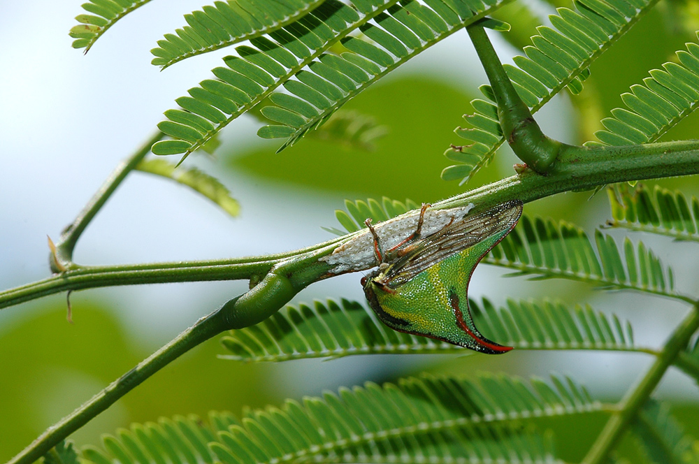Автор: Игорь Поттосин Горбатка Umbonia crassicornis – яркий пример родительской заботы о потомстве. Самка охраняет кладку, нимф (до формирования жёсткого экзоскелета), и ещё 2-3 недели находится с потомством после их последней линьки. Она отгоняет хищных клопов, личинок мух-журчалок и божьих коровок. Нимфы сигнализируют матери ( в частности, синхронными вибрациями) и она как клуша кидается на их защиту. Единственным её оружием являются резкие движения в сторону агрессора, это угроза- не более. Несмотря на это, выживание кладки и нимф (последние в отсутствие матери рассеиваются) критически зависит от присутствия матери. Снято в Колиме (Зап. Мексика), в сентябре 2008 г.