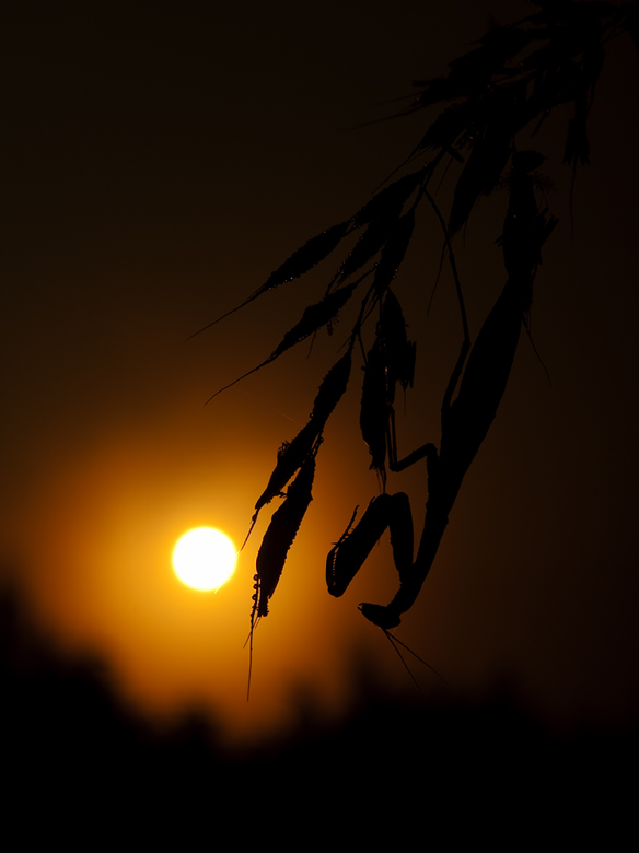 Сквозь густой туман еле-еле пробиваются первые лучи восходящего солнца, согревая просыпающегося богомола.