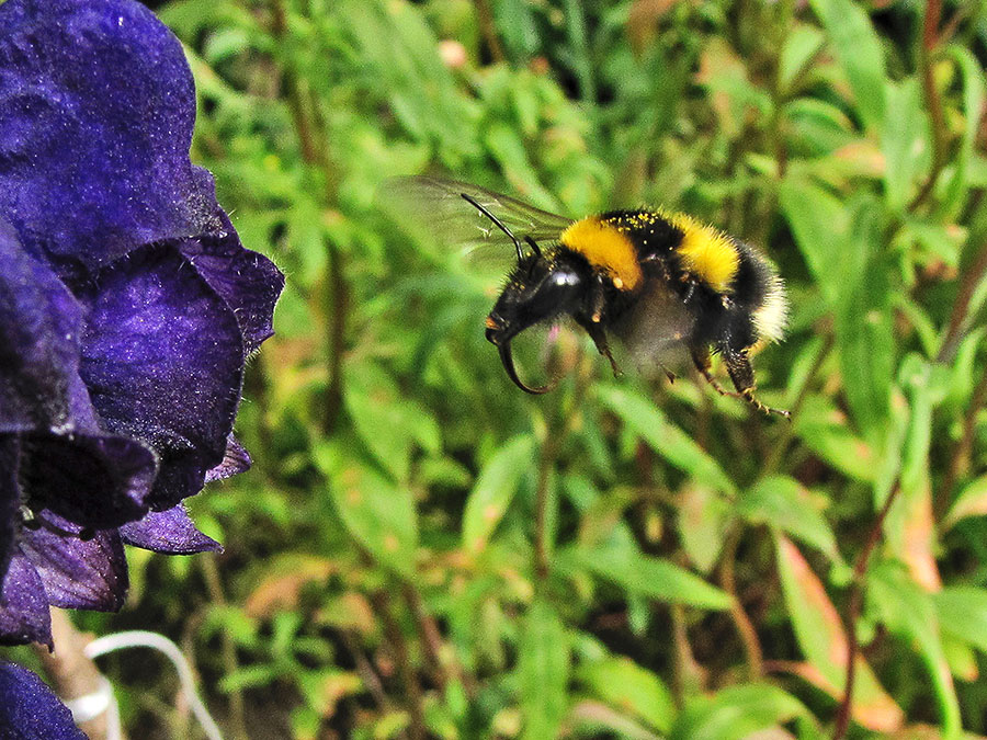 Шмель земляной (?) подлетает к цветку аконита. Снимал в режиме "супер-макро" только одиночными "выстрелами", потому что серийной съёмки у моей камеры нет. Камера - Canon PowerShot SX10IS