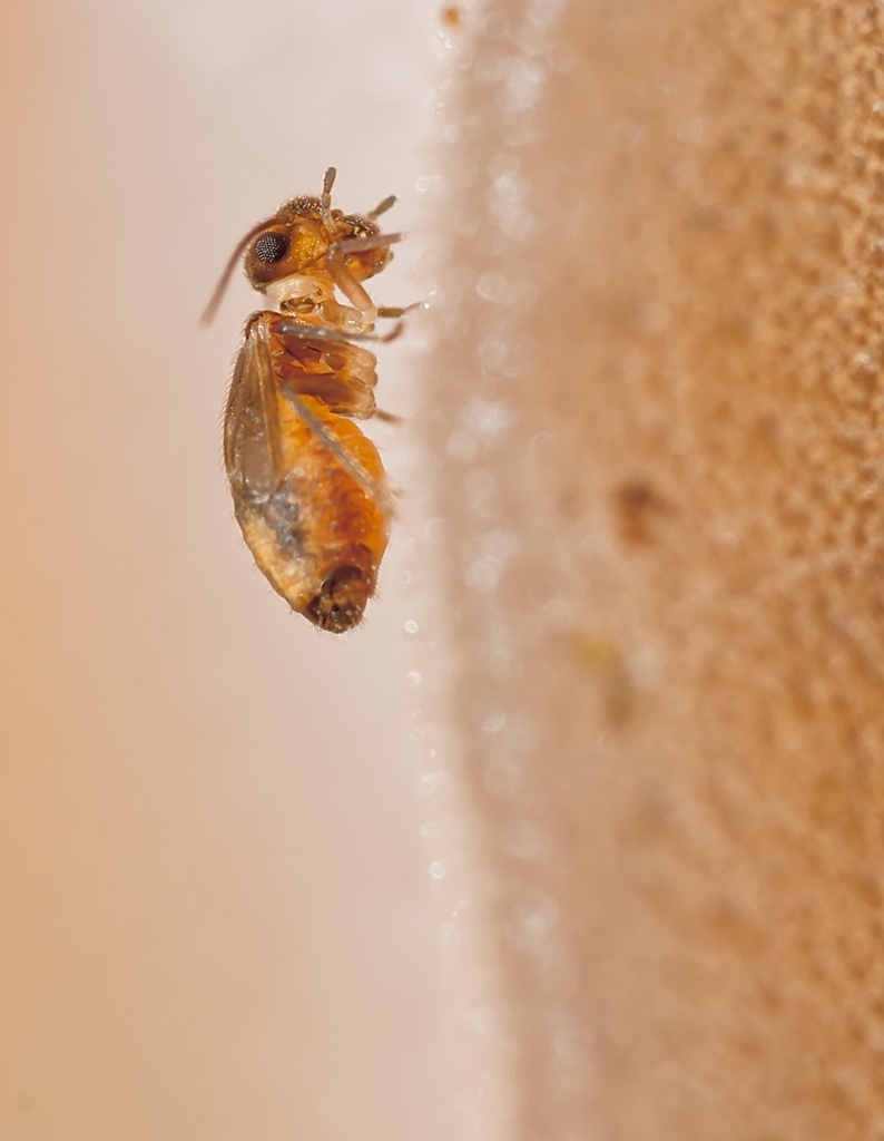 Гриба, конечно, не видно. Коллембола сидит на самом краешке гриба-дрожалки с внутренней стороны. Размером, ну, пусть будет 1,1мм, врядли больше. Снято в Псковской области в августе 2011г. Спасибо Марие Всеволодовне за предоставленный Рейнокс-250. Canon 7D, Sigma 70mm 2,8 EX DG macro, макрокольца Kenko 36+24+12, Raynox 250, Manfrotto 190XPROB/