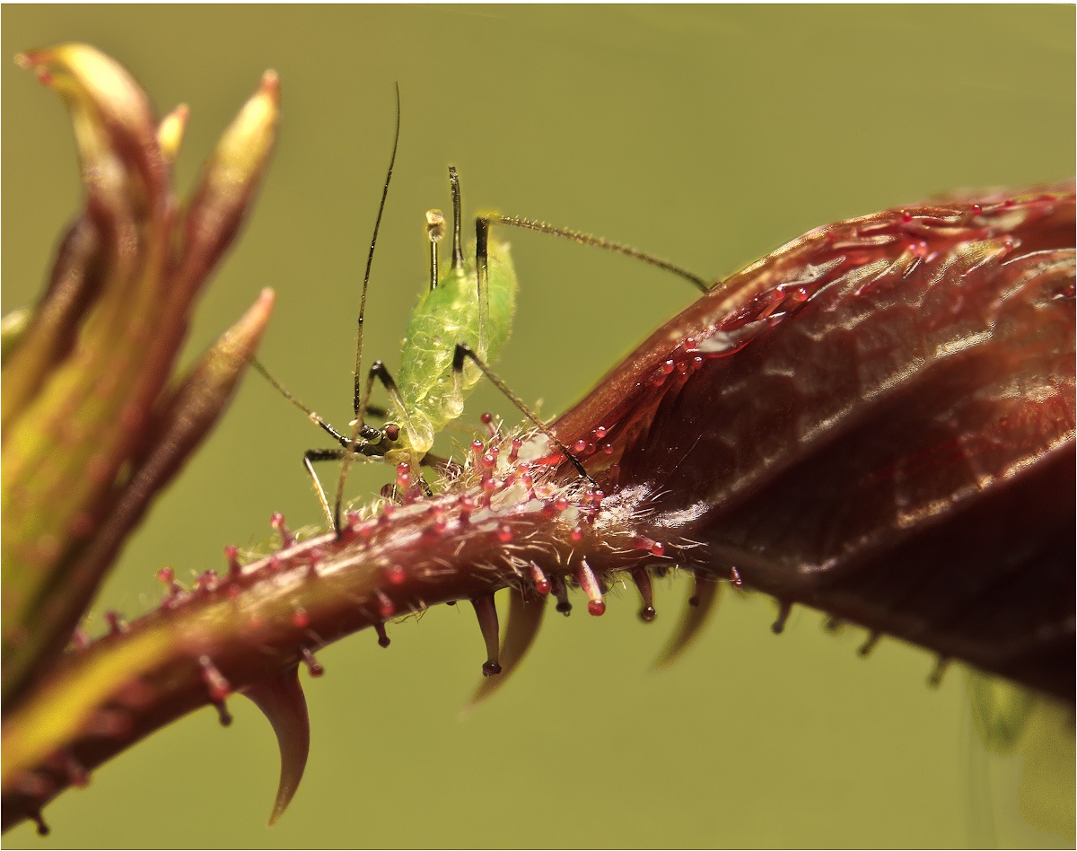 Новорожденный лист розы и бутон в засаточном состоянии, а между ними тля. Борисова Грива Ленинградской области.
