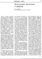 Пытался кое-что сделать в этом направлении  Вот одна из первых статей......А так мне уже было у кого учиться: Уникальная здоровенная книга ч/б. макрофото V.J.Stanek,чешское издание в 50-х г.; Lech Wilczek ( "Глаза в глаза",1959; "Яичко яичку не равно",1962; "Красочные встречи "-цв.,1965); В.Н.Минкевич "В мире растений и насекомых",1957 "Охота с фотоаппаратом",1962; П.А.Мариковский "Охота с фотоаппаратом",1965; И.А.Мухин "Фотоохота",ч/б.,1978,1985,цв....а Н.Сладков,В.Песков В.Тыщенко?! В эти времена макрофотография-фотография мелких животных ,называлась фотоохотой. И я после моей покойной спаниэлихи Марты ,уже когда детскую экологическую студию вел,бросил кровную охоту и перешел на фотоохоту. А потом статьи в "Биология в школе","Защита растений" ,книжки......
