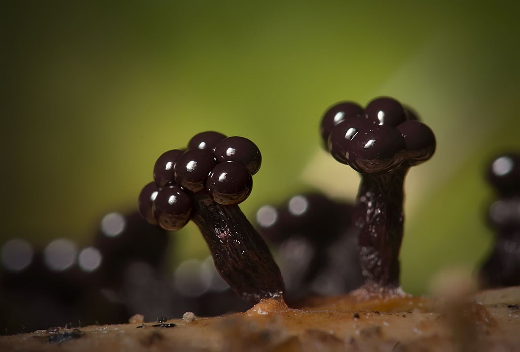 После того, как появился второй снимок этих красавцев-миксомицетов, пригляделся к ним более внимательно. Полагаю, что с метатрихией-осинное гнездо (Metatrichia vesparium) погорячился. Для нее не характерна столь выраженная ножка, да и другие признаки свидетельствуют, как мне кажется не в ее пользу. Вероятно, это другой вид метатрихии - метатрихия цветковидная (Metatrichia floriformis).