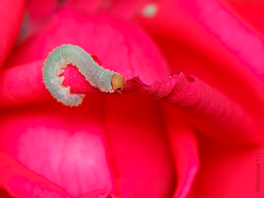 У нас в конце мая проще было гусениц встретить. А сейчас еле нашла эту маленькую гусеничку. Снимала в сумерках с длинной выдержкой на ветру.