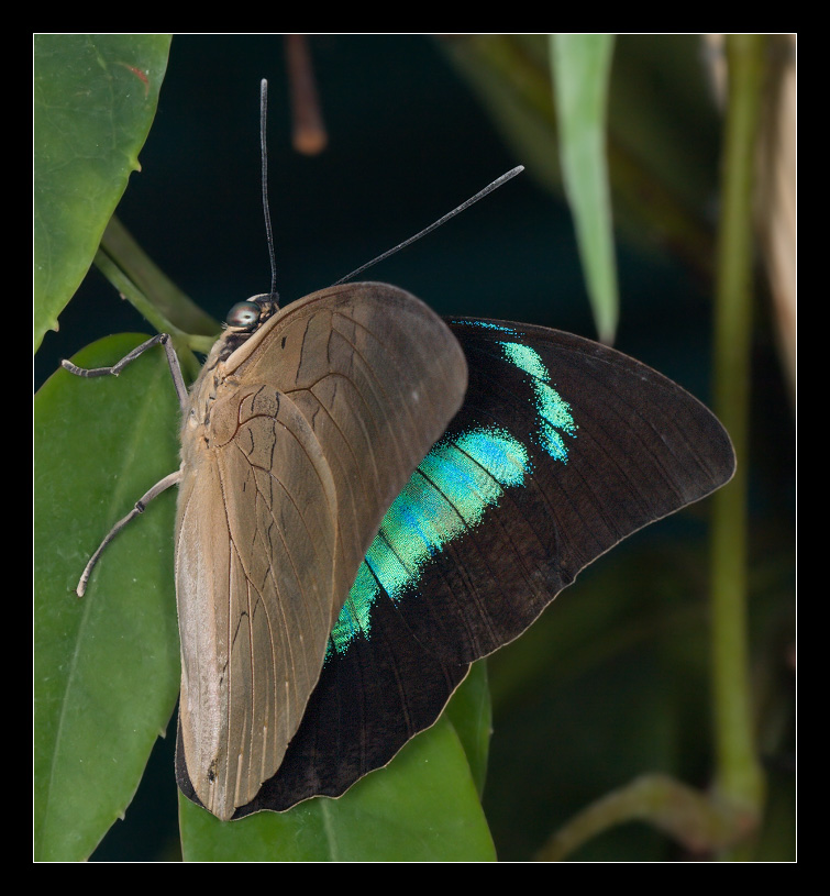 Обнаружил ее сидящей на стволе ... ммм... скажем фикуса (в растениях не силен, увы)  , причем заметить ее оказалось не просто - со сложенными крыльями маскируется превосходно! Попробовал пересадить на более открытое место, чтобы снять - получилось, и тут она приоткрыла крылья, сверкнув изумрудной зеленью с металлическим блеском. Один кадр удалось снять. А когда я попытался ее попросить еще раз приоткрыть крылья, чтобы снять дубль, она почему-то обиделась и улетела. Полет в отличие от peleides мощный и стремительный. Что за вид, не знаю, увы, но больше таких я в этот день в этом Дому не встретил...