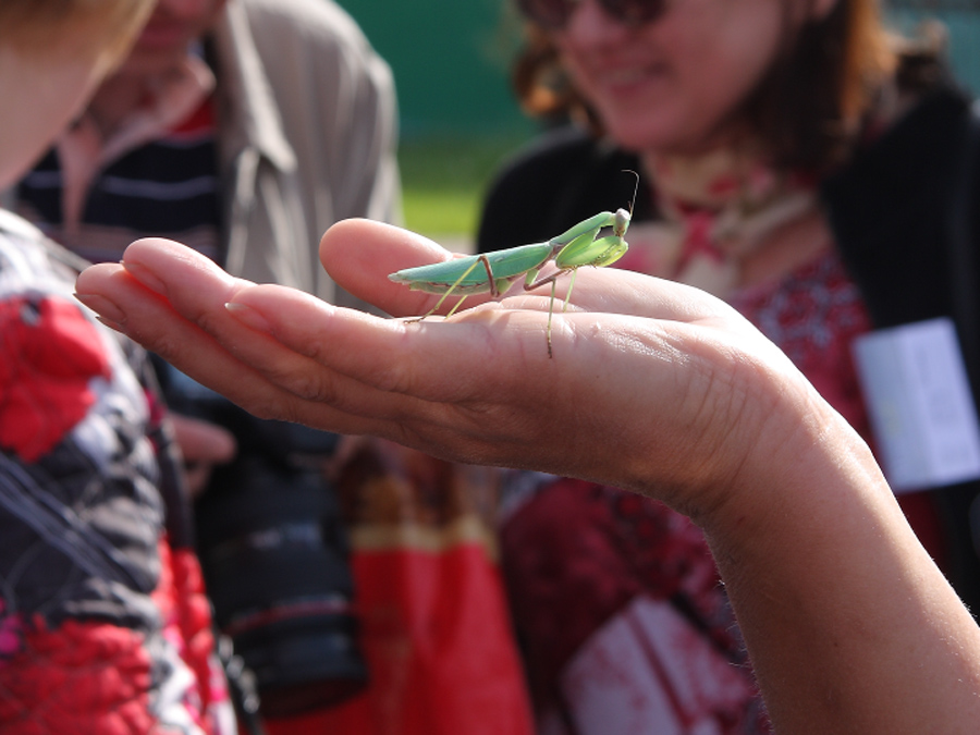 Да, он вообще ему чуть палец не отъел! Вообще-то богомолы так не делают, это он от стресса, бедненький - столько народу и все объективами тыкают.