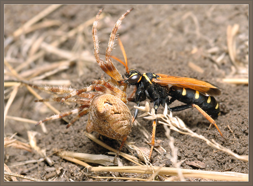 Сидели с женой, ужинали у палатки - рядом увидел осу, которая рыла нору. Естественно поснимал и вслух высказался насчет снять бы ее с пауком. Буквально через пару минут она отлетела в сторону, где лежал припасенный паук и потащила его в нору. Увы - получился один этот кадр, на втором - вспышка не успела подзарядиться (аккумуляторы подсели), а на третьем только ноги паука, торчащие из норы. Снимал уже почти в темноте - было пасмурно и света мизер, поэтому качество не желаемое, увы.