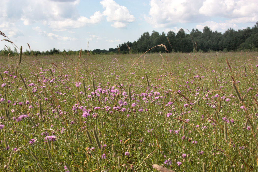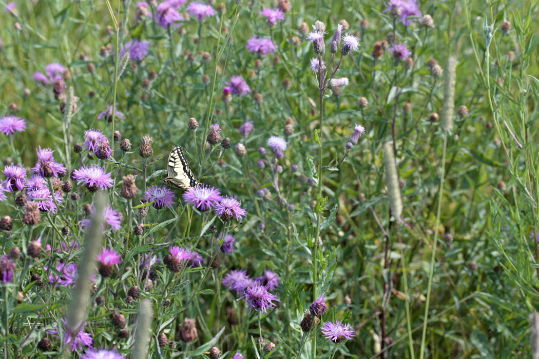 Вот на этом прекрасном июльском лугу в море розовых луговых васильков мы с Мариной и встретили нашего первого здесь красавца махаона. Он быстее чем мы его увидели заметил нас и серым невзрачным воробьем (так он смотрится в полете снизу) рванул к лесу. Недоумение, разочарование в глазах у обоих, а потом мой радостный танец - "Батюшки! Да они здесь появились.....значит, я все равно их найду и сниму!"