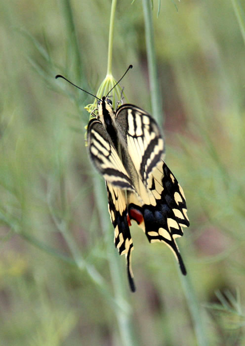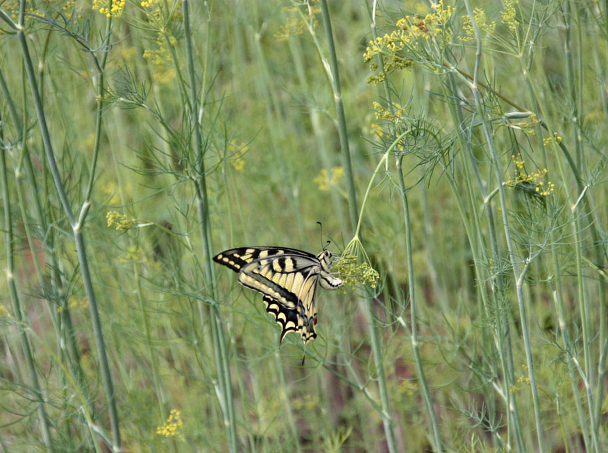 Через час, выйдя на огород за зеленью, я раскрыл рот от удивления....и сердце, о, мое бедное сердце! Через забор, с того самого луга (по направлению) переМАХИВАЕТ мой махаон. А может и не мой, может, другой? Но я так намучился за эти дни, мне так хотелось чтобы это был именно он!!! Вернулся, схватил фотик (и о, Боже! Когда же успел вновь поставить на место 60 - ти десятку? Педант ты, старый, аккуратист фигов.....