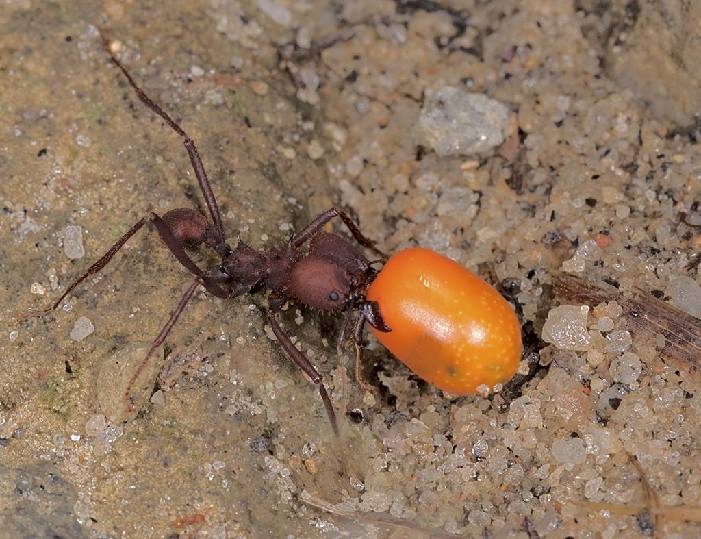 Эти волоком поодиночке вообще ничего не таскали, только, если сообща, и то редко. Впрочем, вот так, в челюстях, тоже не часто, видимо, когда груз был все-таки полегче. Чаще всего они несли груз на голове, роняя и подбирая снова. Очень они при этом напоминали африканских носильщиков, особенно с этими оранжевыми ягодами. А вообще они не настолько уж крупные - миллиметров 7-8, наверное.
