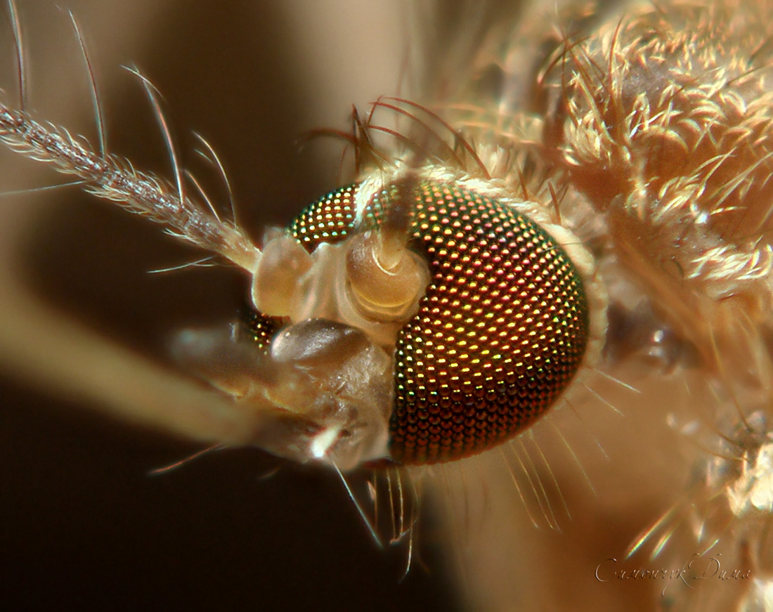 Здорово! Вот это комарище! Фасеты прямо как металлические шарики!