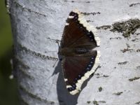 Первый раз такая встретилась. Раньше в эту пору репейница, павлиний глаз, да лимонница попадались. Размером меньше раза в два, а то и в три упоминавшихся ранее. Нижние крылышки у неё жёлто-оранжевые. Не удалось хорошо с раскрытыми крыльями сфотографировать. Садясь на ветку, она сразу крылья собирает. А с раскрытыми крыльями сидящей на земле можно было найти, но только один раз к ней удалось близко подобраться.