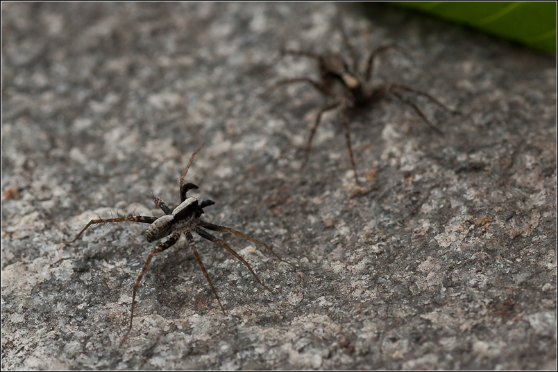 Поза дядьки говорит за себя: это ухаживание, самец демонстрирует чёрные бульбусы на педипальпах, помахивает ими. Его внимание полностью поглощено "дамой сердца". А та остаётся осторожной, как всегда, реагируя на малейшие опасности. Самцам приходится подолгу "уговаривать" самок, пытаясь даже не вызвать в них ответные чувства, а просто успокоить. Возможно, перед этим она уже насторожилась, заметив опасность в виде фотоаппарата с фотографом, а слишком близко подбежавший самец переполнил чашу терпения и она удрала.