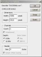Жаль: CS3 не дружит кажется с .RAW, мой Кэнон сохраняет в .CRW, их CS3 открывает. Ни 8, ни 16 бит не идет.