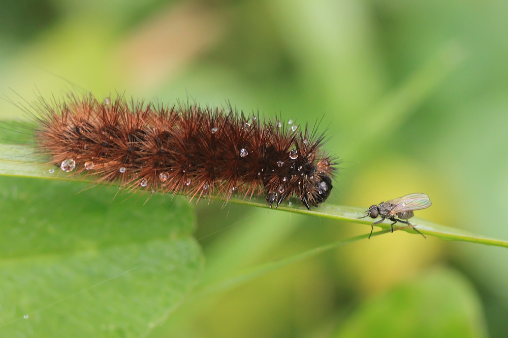 Интересно, что в следующий момент эта муха подошла к гусенице вплотную и буквально дала ей лапой в глаз, а затем мгновенно улетела. Жаль, но этот эпизод не удалось заснять с подобающим качеством...