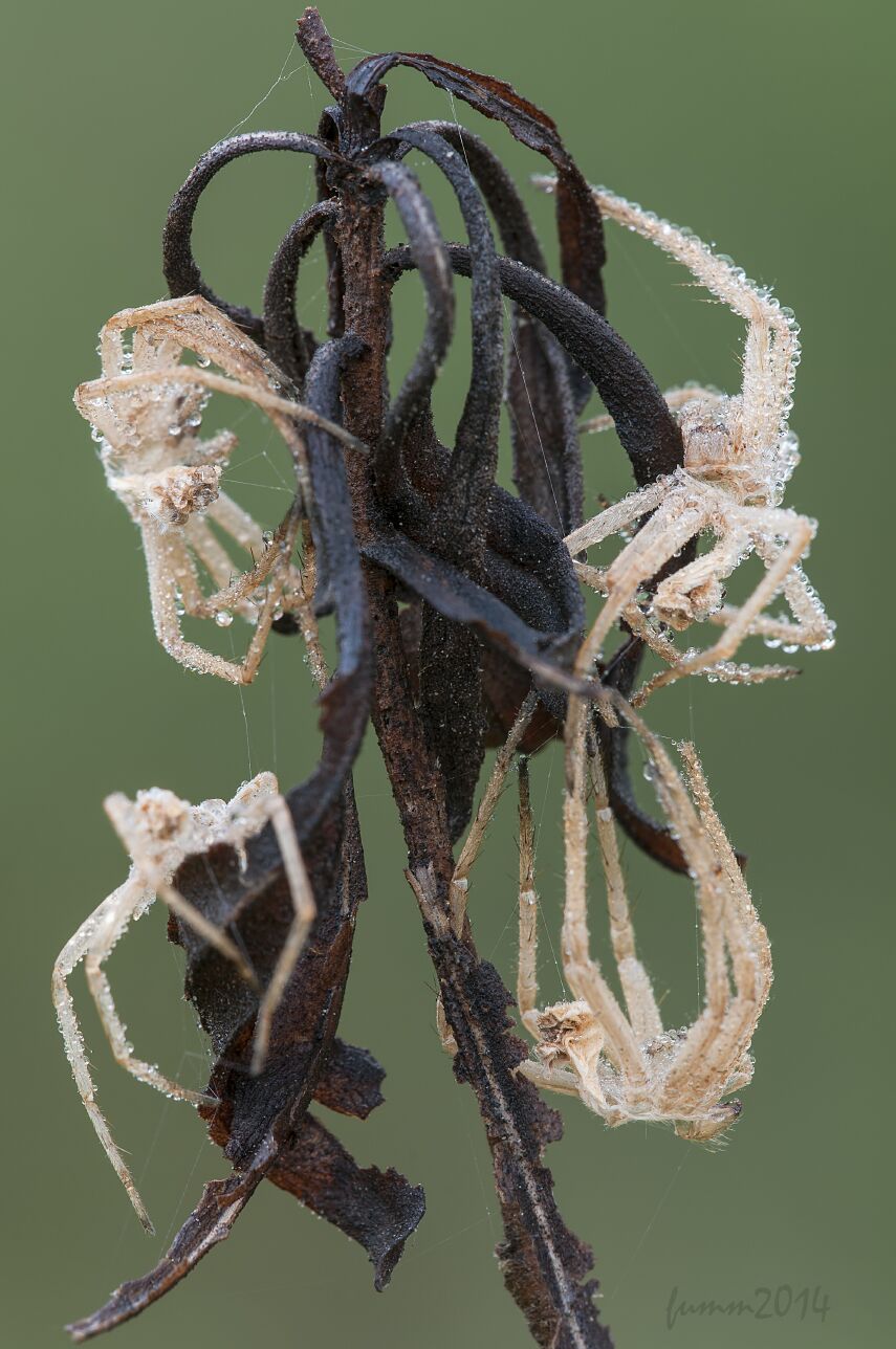 FUMM: ББ сильно в фиолет (бывает у ФШ).С построением кадра вижу некую проблему: главный герой-сухой бутон, а не паучишко. В подобных случаях беру мягкую травинку и просто выгоняю зверя на ПП. Психованный норов зеленых пауков мне хорошо знаком, но важен результат.Надо рисковать.