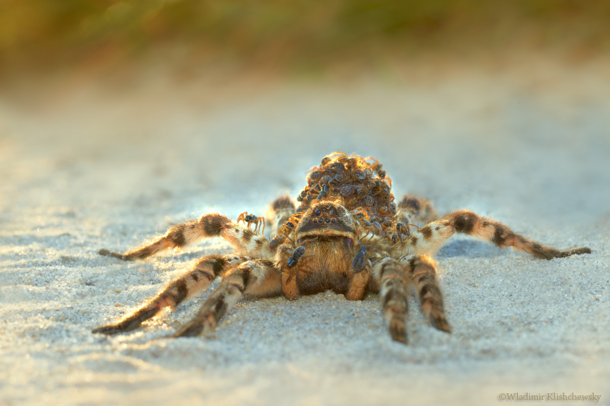 У тарантулов 3 ряда глаз, ещё один ряд (2 глаза) находится выше двух больших, "на макушке", поэтому хуже заметны. Я такую однажды поздно осенью поймал и в банку посадил, пол-зимы кормил мухами (уже не знаю где зимой их добывал), а потом она перестала охотиться и в норку закопалась... а к весне как вылезла с потомством ААА! Через 3 дня их стало в 3 раза меньше, зато размеры в 3 раза увеличились  пришлось срочно искать культуру дрозофилы. А потом их кто-то уронил и они по квартире разбежались ААА ААА! (Мамашу я к тому времени уже выпустил). Позабивались в щели и некоторые несколько лет там жили, пока их всех не выловили.