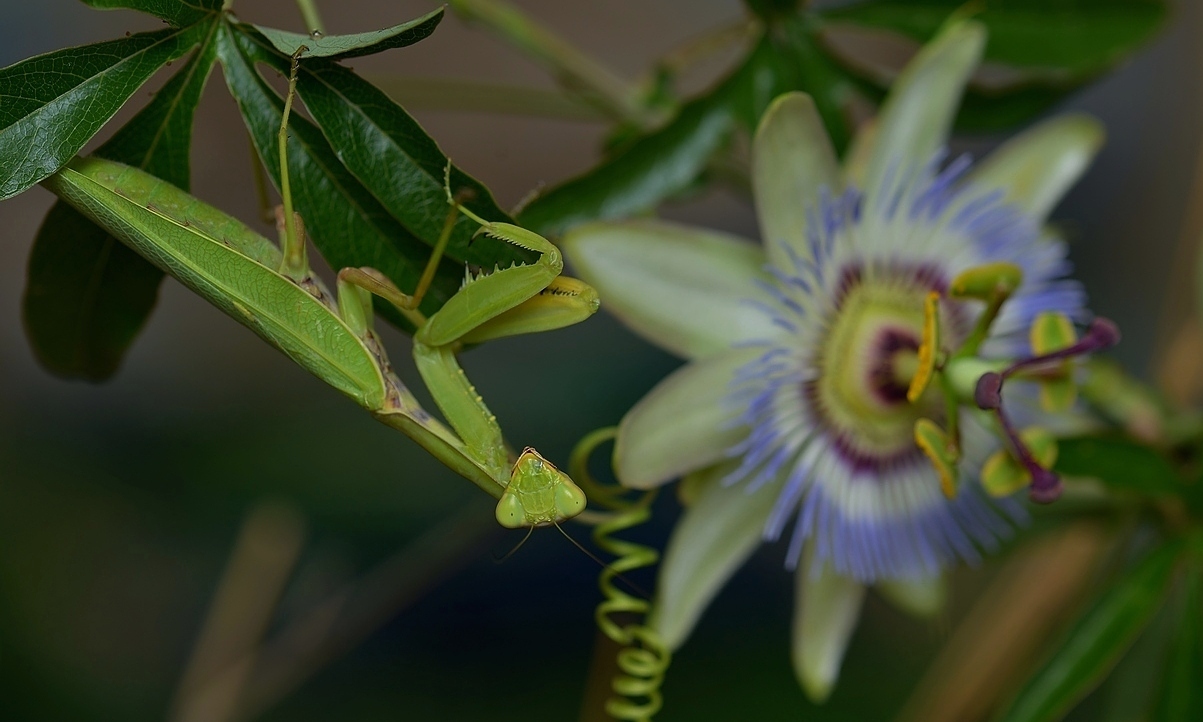 Замечательный снимок, мне очень понравился! Богомол как бы сомневается, ползти дальше к пасифлоре или не стоит...