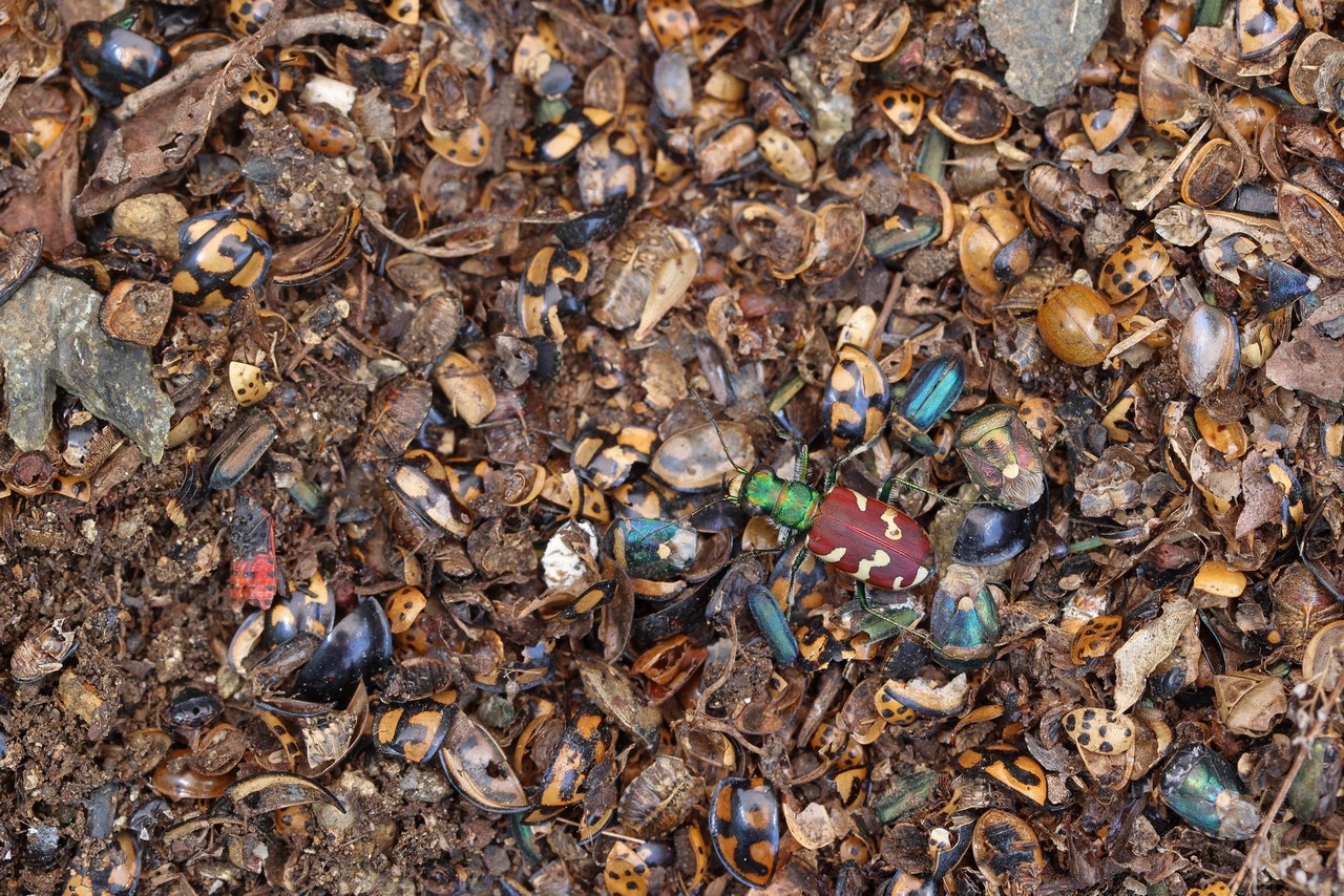 Предположу, что у подножья скалы в которой массово зимуют насекомые, с годами скопилось множество погибших, или не перезимовавших насокомых.