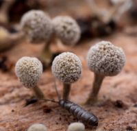 Белые паутинистые объекты на фото 8 могут оказаться не миксомицетами, а зачатками (примордиями) каких-то грибов. мне показалось, что это зачатки вот этих экземпляров. Это не миксы? Хотя сейчас уже не вспомню доподлинно в каких обстоятельствах это снималось. Но кадры соседние