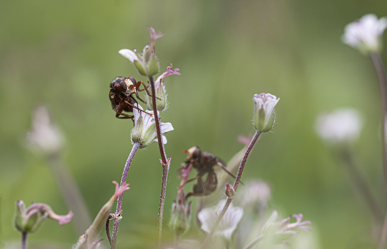 Сидят некоторые пчёлки, как арестанты, подолгу. И погибших встречал и полуживых от голода вытаскивал травинкой. Домашняя пчела выходит свободно тем же путём - через открытый "люк". Ей это легко даётся благодаря внушительным размерам. Но она - не опылитель. Мелкие дикие пчёлы проползают с пыльцой позади головы под рыльцем через щели-окна позади, как им и предписано строением нижней губы. В тяжёлой ситуации оказываются пчёлы среднего размера. Если внутри находятся сразу 2-3 пчёлы, то самая мелкая показывает путь более крупным. Но "бомбовозы" не всегда справляются с этой задачей. Хотя, куда интереснее вопрос: а полетят ли они в следующий башмак после таких мучений, да ещё без взятка?