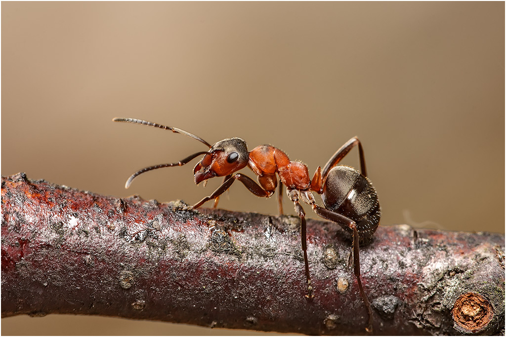 Я поступаю иначе, беру на съемки с собой старую тефлоновую сковородку. Не удивляйтесь, это достаточно безобидно. Недалеко от муравейника, на хорошо освещенном месте организуется рабочий «стол» из подручных материалов (перевернутое ведро, ящик, коробка и т. п.). Главное, чтобы было соразмерно штативу и сидя на земле шею не очень надо было бы выворачивать. Если надо избежать черного фона, сковороду заворачиваю в полиэтилен. Насыпаю тонкий слой песка, наливаю воду и ищу подходящий камень. Он должен быть пирамидальной или конусовидной формы с усеченным концом. Устанавливаю его посередине сковороды. Кромка воды по возможность должна совпадать с верхом камня. Присадой может быть дощечка, небольшие листья, срезанный со старого пня кусок мха или то что подскажет вам ваша изобретательность. Камень желательно должен быть незаметен. Его роль это роль якоря, чтобы листья от ветра не вздумали уплывать. Вспышка(и) у меня на соседнем штативе(-вах), с фотоаппаратом соединена проводом или синхронизаторами. Теперь можно запускать муравьев. Конечно это постановочная съемка, но в ней есть не малые плюсы. Муравьи не разбегаются по своим делам, некоторые даже соглашаются позировать (не часто надо признать). Очень прискорбно, что среди них встречаются форменные камикадзе, лезут в воду и пытаются утопиться. Однако в ограниченном пространстве сковородки их легко выловить, высушить и отпустить с миром как профессионально непригодных для фотографии.