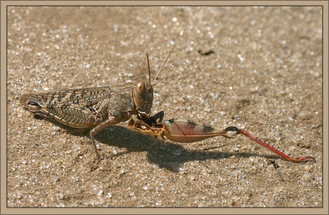 Коллеги, пардон, но тут же достаточно ясно, что происходит. Клоп- хищнец, гусеницу он просто высасывает. Хоботок, воткнутый в жертву, увидеть из-за ракурса невозможно, но думаю, что автор подтвердит.