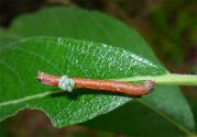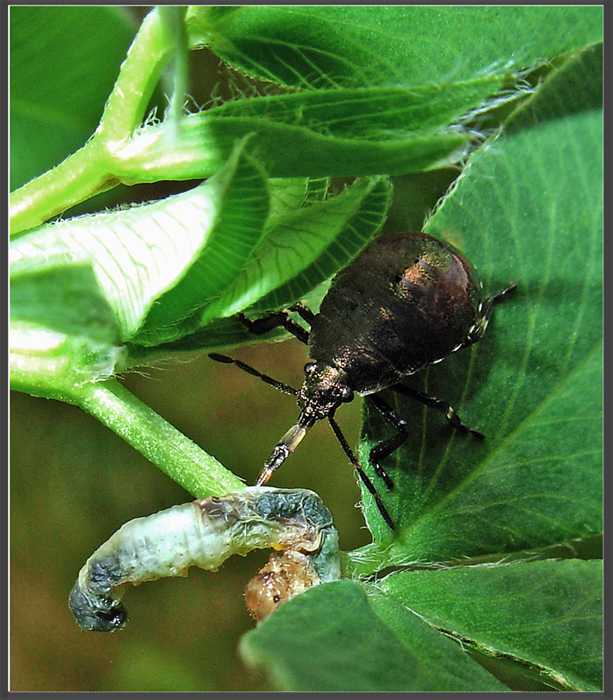 Повернул чуть-чуть лист -гусеница отреагировала, она жива.Поэтому вопрос о клещах остаётся. Видел что-то подобное на стрекозе.