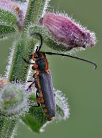 1. Фото отличное. Недостатков не нашёл (это ведь всего-навсего JPEG). 2. Думаю, что определён он Вами верно. Если бы это было у нас в Украине, то можно было бы грешить на усача желтушного (Phytoecia icterica), но этот и поярче и, что важнее, лапы и брюшко другие. Замечен был мною только на шалфее и только в одном месте (больше шалфей не попадался), на поляне куда меня любезно пригласил FUMM. Причём, что интересно в большинстве случаев в компании на одном стебле с Stagonomus amoenus , которые занимали верхние розетки листьев, а Phytoecia waltli сидел пониже. Амоенусы сидели (ин копули) до десяти пар на на одном растении. Благодаря возможности представленной "хозяином" поляны и для знакомства остальных выкладываю другие ракурсы снятые мной для сравнения с Phytoecia icterica, а заодно и Stagonomus amoenus, чтобы понятно было о чем речь. Вам и автору удачи!