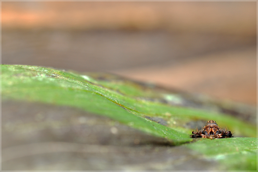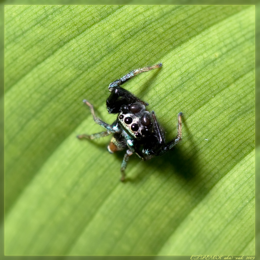Скакунчики часто, вот так повертевшись и хорошенько прицелившись, прыгают на объектив, ежели он достаточно близко