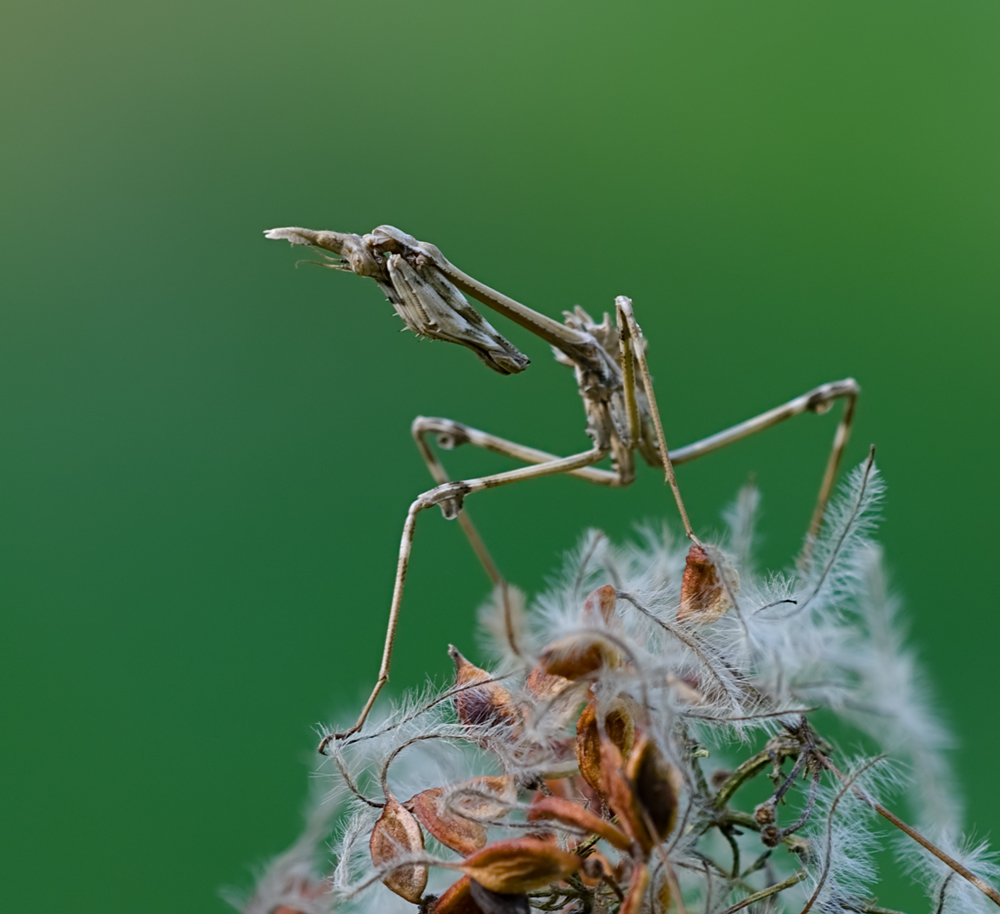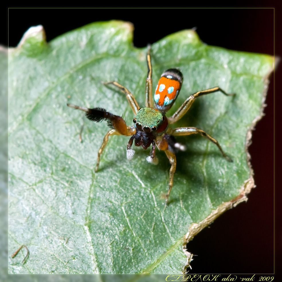 Надо же! Впечатляет... Глазки так и сверкают! Паучок молоденький из сем. Philodromidae. А ужинает он маленькой тлёй, бусинка - это капелька "медвяной росы" (неусвоенного древесного сока) выступила из одной из трубочек на спине у тли. Эти трубочки можно обнаружить на других снимках тлей в подходящем ракурсе (вот тут, например: http://macroid.ru/showphoto.php?photo=31524). Для того и используются - для сброса излишков неусвоенного высосанного сока (в смеси с продуктами жизнедеятельности, наверное).
