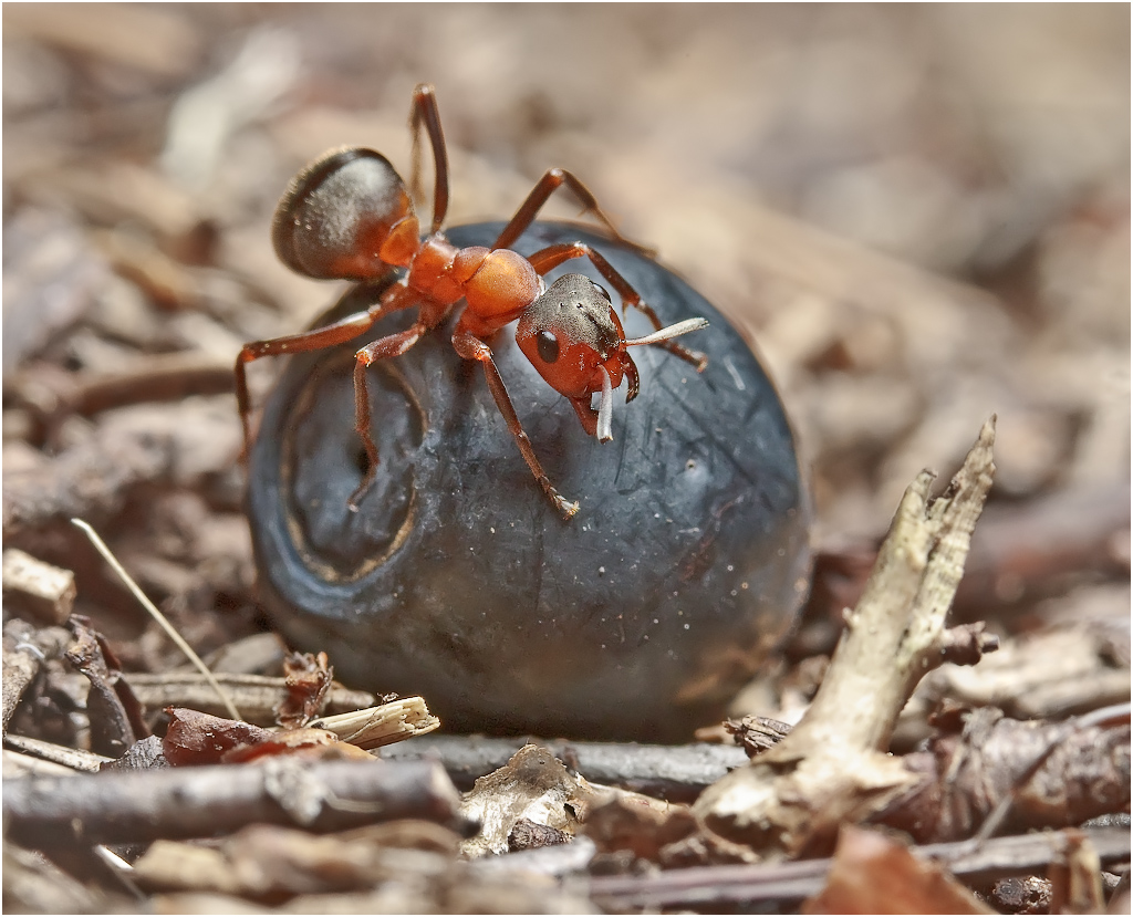 "Вот - думает - дотащу до муравейника и мне "Героя муравьиного труда" дадут! Шутка ли такую черничину добыть!" Ну, а усики завистники пооткусывали.