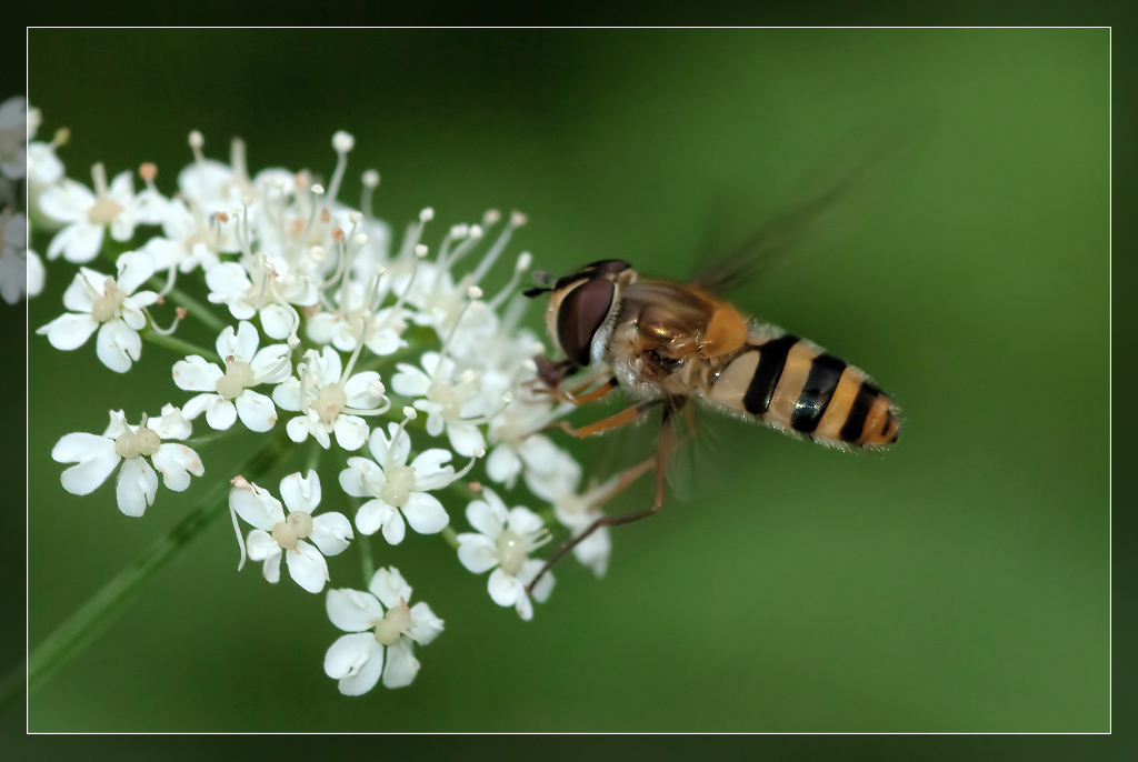 Epistrophe grossulariae. Не частый вид. У меня всего несколько кадров такого. В отличие от Syrphus ribesii и близких имеет более широкие жёлтые перевязи. Не такие широкие как у Epistrophe melanostoma. К тому же все бёдра у самого основания тёмные. Тёмная полоса на лбу идёт до самого основания усиков. В каталог-определитель! =)