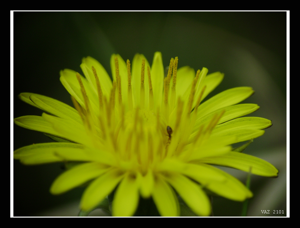 Очень много размытости, не понятно о чем фото: о тычинках? о мутном муравье? о "прекрасно размытом" цветке? да еще в неровной рамочке...