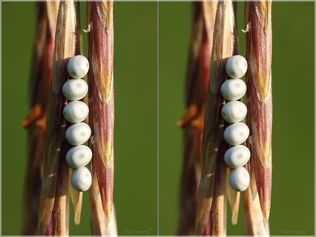 И мы не подвели,Вадим Валентинович.....с утра,как всегда ,с Маришей по яичку  А что касается яиц,изображенных на Ващих как всегда качественных (с новой техникой!) ) снимках,то .....они, по-видимому, (если не врет мой внутренний стариковсий голос?  ) клопиные. Их немного они сравнительно крупные (у бабочек обычно целая грена из мелких яиц) и...... с характерной точкой или буковкой "т",.....хотя чаще они, все же, бочкообразные.  А вообще ,с этими яйцами (если под мамкой не застанешь) сам"черт ногу сломит"