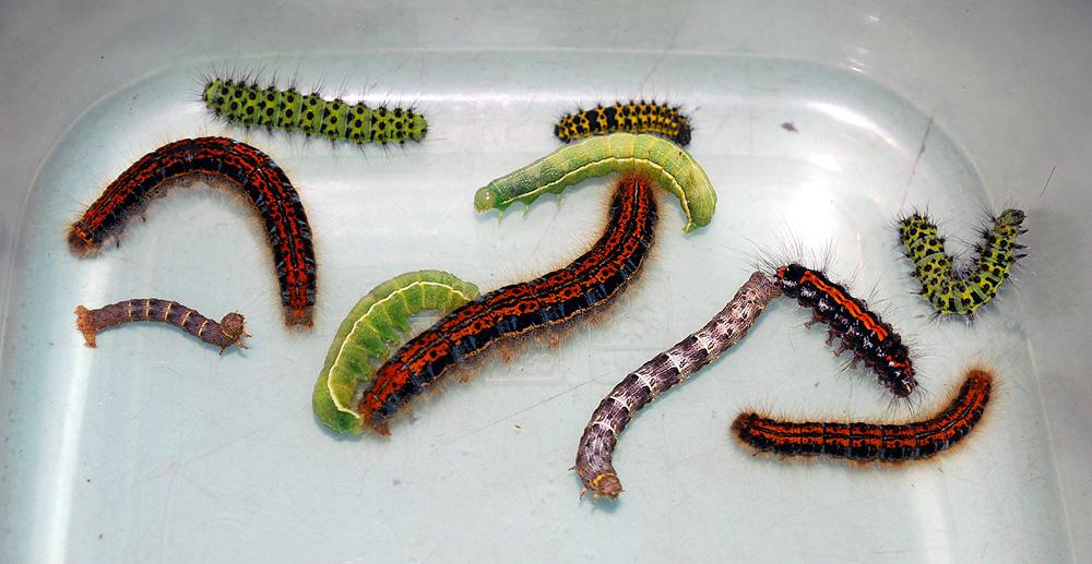 Данная фотография показывает разнообразие мира бабочек в пределах садового участка. Гусеницы собирались с целью наблюдения за их развитием и фотографирования. После сбора они содержались в хороших условиях, снабжались свежим кормом и, в конечном итоге, превратились в имаго и разлетелись (за некоторыми исключениями). Причем здесь морг и гастрономия? Совершенно не понимаю также, как не понимаю охватившего Вас чувства омерзения. Просто собранные гусеницы. Вот и все. Вы их любите только если они собираются не больше чем по двое?